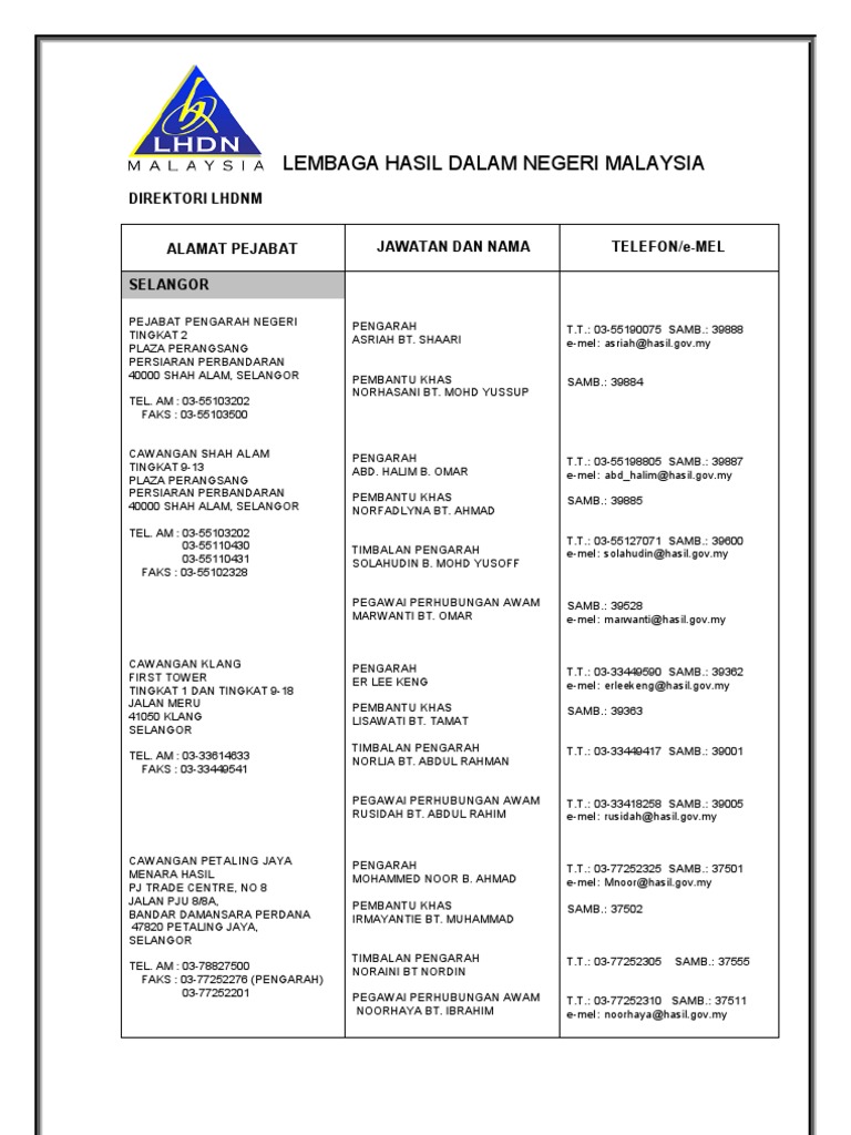 Alamat Dan Nombor Telefon Cawangan Lhdn Negeri Selangor